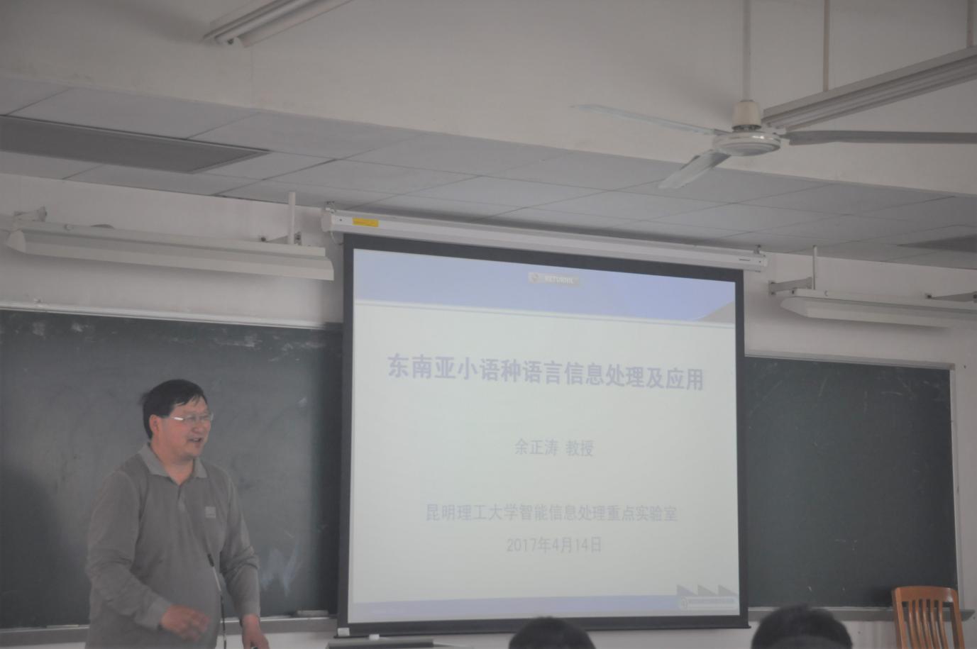 讲座中,余教授首先简单介绍了昆明理工大学智能信息处理实验室,并阐述了在“一带一路”背景下对东南亚语言进行研究和信息处理的重要性。他指出,目前国内外在大部分东南亚语言的研究工作上仍处于空白状态:一方面,不同于英语、汉语等有大规模的、成熟的语料库,东南亚小语种语料库资源稀缺,很多语言都缺乏相应的词典、分词、词性标注、句法树库等资源,极大地限制了东南亚语言信息处理的发展;另一方面,与汉语相比,很多东南亚语言在词法和句法上存在较大的差异,也因此需要从语言本身的特性出发,设计对应的解决方案。针对泰语、越南语、缅甸语和柬埔寨语,昆明理工大学紧密结合前沿的自然语言处理技术,进行了一系列开创性的工作并取得了不少研究成果,包括词典资源建设,词法分析方法、机器翻译、跨语言信息检索等等。