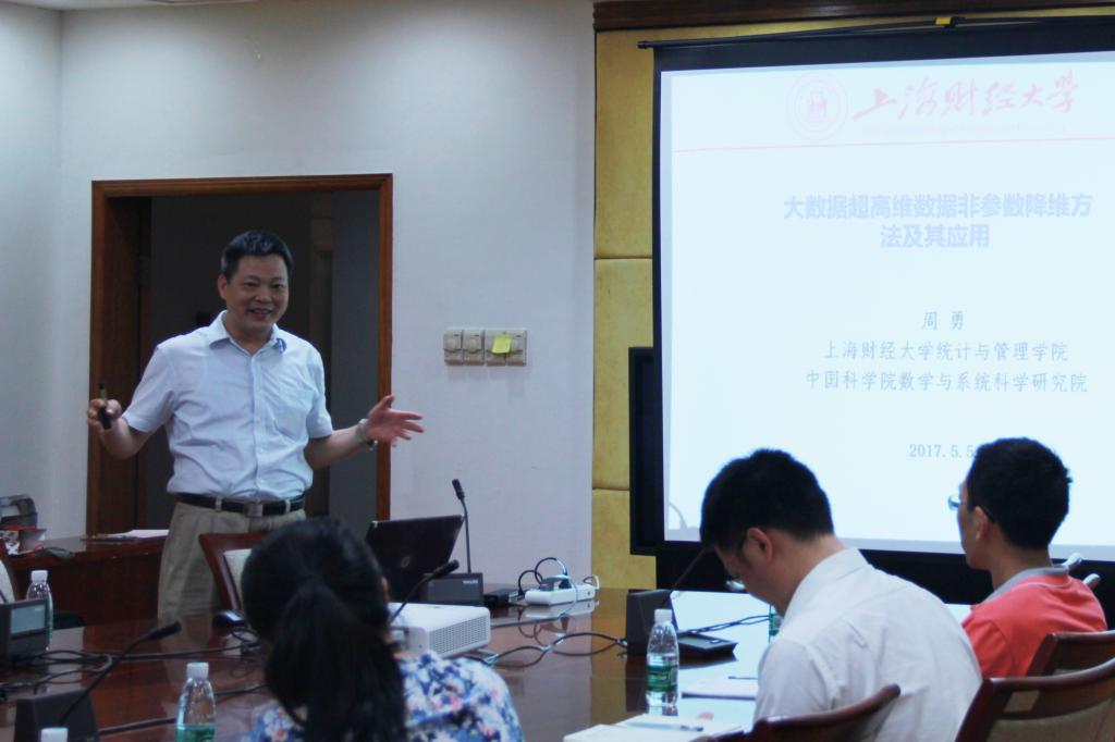 本网讯 5月5日下午,上海财经大学统计与管理学院周勇教授做客广外著名教授论坛第327讲,在我校南校区校办公楼第一会议室分享主题为“大数据超高维数据非参数降维方法及其应用”的研究成果。本次活动由我校人事处、bc365主办,我院承办。我院院长易行健教授、副院长展凯教授和姚海祥教授以及教师代表出席讲座。讲座由姚海祥主持。
