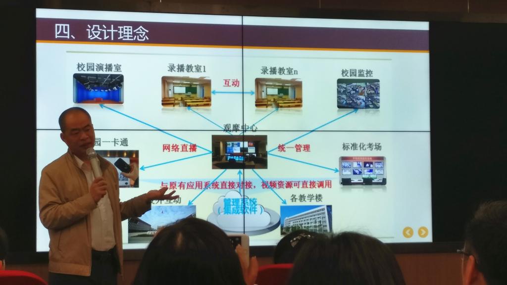 肇庆学院教师教育学院教育技术与计算机中心副主任盘炜生则以肇庆学院为例,着重介绍了肇庆学院的远程教学交互中心。他指出,搭建学校教师能力发展的高水平平台,离不开教师教学资源建设、教学技术支持、教学研讨交流及教学效果测评,要以信息化建设为主线,提高教师的基本能力、教学能力、教育能力、教研与自我发展能力和创新能力,全面推进bc365教育现代化;他认为,不仅要实现有线、无线网络全覆盖,服务器虚拟化、存储高性能化,更要实现校内外之间的互动教学和互相观摩等。