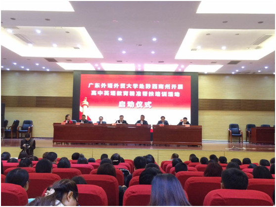 25日,活动启动仪式及英语教育培训在兴义一中多功能报告厅举行,黔西南州教育局局长梁喜明、副局长刘玉川,以及来自黔西南州辖区内七县一市的100余名高中英语教学骨干参加了活动。梁喜明高度评价我校近年来对黔西南州教育的帮扶活动,他提到,在广外的大力帮扶下,黔西南州的英语教学有了教大提升,全州2016年高考英语平均分较2015年提升10.37分,助力10750名学子成功考入一本。随后,冯光武、田振两位专家针对高考英语学科备考、高中英语教学两大主题对广大学员进行了培训,从命题分析、题型解读、复习重点、英语教学改革等方面做了专门解析。会后还进行了深入交流,学员们均表示受益匪浅,接下来将学习所得与教学实践做好结合。