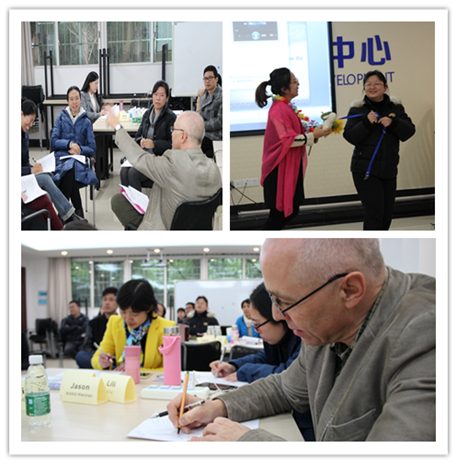 第三阶段集中培训中,导师首先回顾前两阶段学员所学知识,并根据第二阶段学员所录的实际课堂视频,从课堂引入、语言支持、互动设置、课程讲授及结束部分开展针对型的同行观摩,让学员深入分析全英课堂中的各个教学环节,创造性地的利用玻璃鱼缸式(fish bowl)模式开展同行反馈及讨论机制,促进学员内化有效的全英教学方法,引发自省。