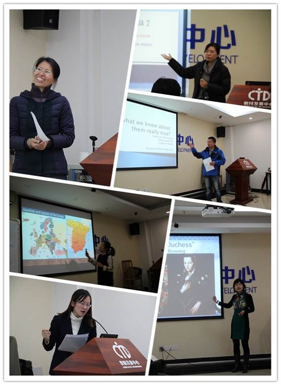 该部分培训以学生为中心,除了视频观摩外,导师基于第二阶段的培训效果及行动计划,选取了颇具代表性的六名学员进行了现场微课展示,其他学员进行有目的性的观察,并进行反馈讨论。六名学员分别就市场营销调查、“一带一路”的背景下中国与马来西亚的关系、西班牙钢琴乐的黄金时代、跨文化交际中成见问题、《My Last Duchess》“不可靠叙述者”等专题进行展示。六位老师匠心独运,无论从主题的导入、课堂讨论安排、小组活动还是在学生问答反馈方面都有自己独到的处理方法,可圈可点。