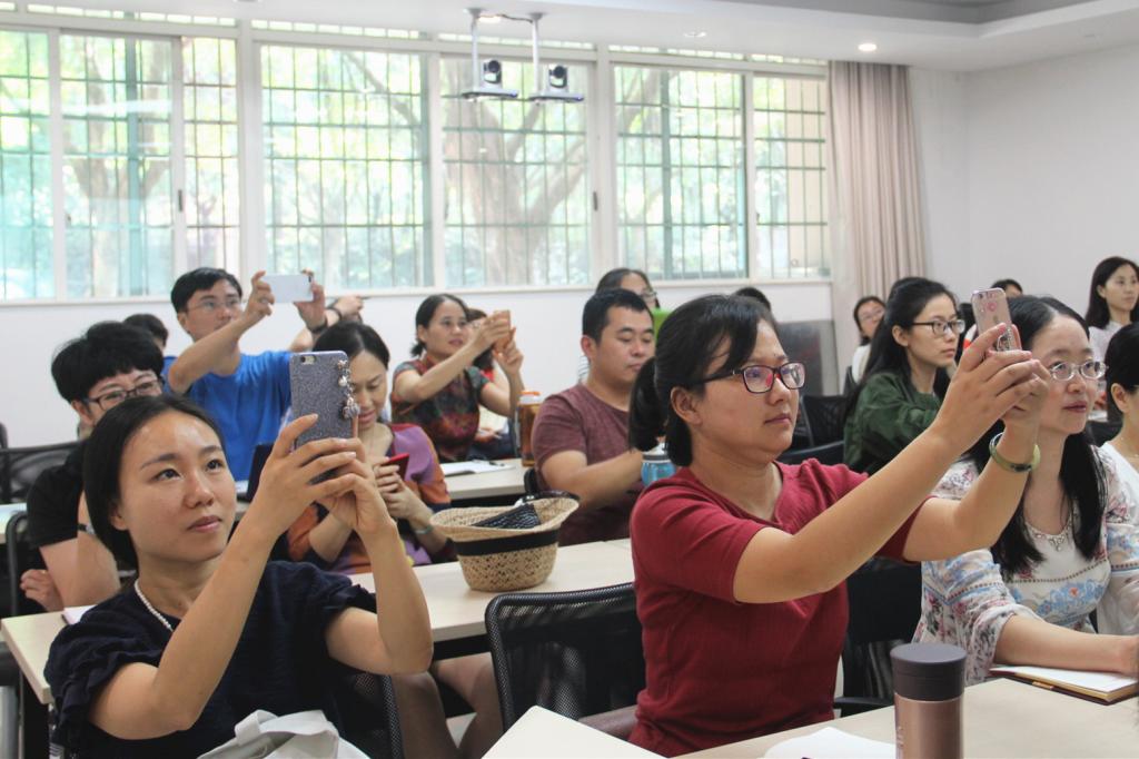 华南师范大学博士生导师、未来教育研究中心主任焦建利教授以贴合生活的例子及丰富的多媒体材料切入,从开放世界中的学校教育,讲述如何利用手机创建互动课堂及运用技术促进科学研究,介绍了用慕课实现教师专业发展。焦建利围绕一个二维码,以风趣幽默的语言,循序渐进地为在座学员讲述如何利用手机等技术来创建互动课堂。