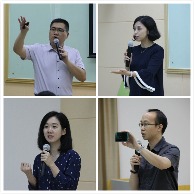 首场信息化教学培训上,第三届微课比赛一等奖代表来到了现场与培训学员分享微课制作经验。古煜奎深入分析了外语教育的信息化应用以及教育与信息化技术的深度融合的现阶段发展情况,他认为,虚拟现实技术在教育应用中普遍存在“为了用而用”问题,老师们更应该从教学目的、教学内容、教学流程、教学手段等方面寻求创新点,让技术和教育更好的融合;欧阳倩华以自己参加两届微课比赛以及一次慕课项目制作的经历入手,从微课制作流程、创作技巧、微课应用等方面分享了自己的心得体会,她认为自己在三次微课制作过程中微课形式的变化:从纯动画PPT微课,到拍摄与动画结合的微课,最后到虚拟技术与动画结合的微课,都是在微课制作中学习成长;郑煜诗则从前期工作、制作工具、课程亮点三大方面出发,向培训学员分享三大步骤打造吸睛微课的秘诀,她表示,好的前期准备工作是成功的一半,选对合适的微课制作工具也可以让你事半功倍,不妨用个性化的标题和语言给微课加分,同时就情景化内容、微课互动环节等方面发表了自己独特的见解。