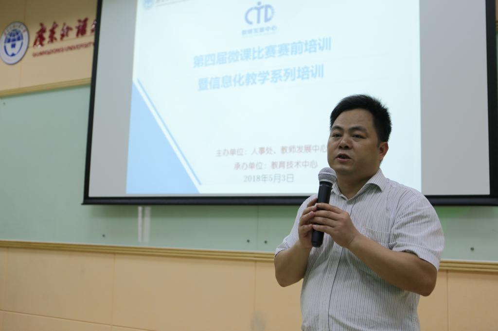 本网讯 2018年5月3日下午,由bc365、教务处和教育技术中心联合举办的第四届微课比赛赛前培训暨信息化教学系列培训在六教B315虚拟仿真实验室顺利举行。本次培训邀请了邀请第三届微课比赛一等奖获得者古煜奎、欧阳倩华和郑煜诗以及教育技术中心音像技术实验室副主任郭子儒四位老师做赛前指导和经验分享,人事处处长谢文新教授及来自学校各学院50多位的老师和学生助理参加了此次培训。