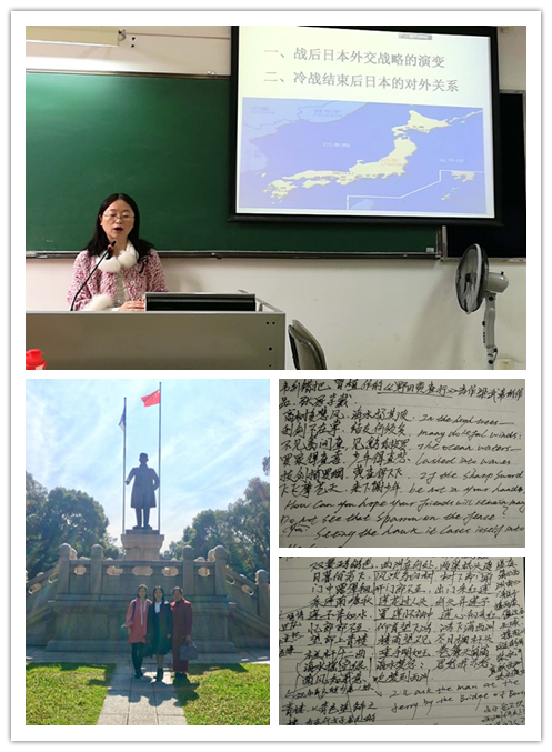 研修花絮:(上)陈丽娅在导师课堂授课、(左下)学员进行文化考察、(右下)付强的翻译笔记手稿