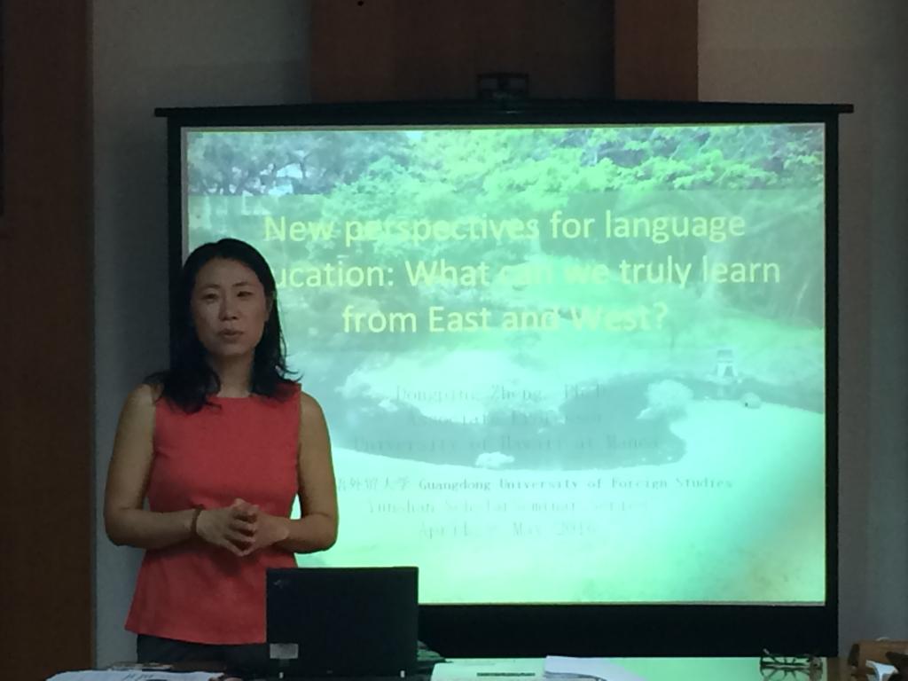 为推动我校英语教师的专业发展,bc365联合英语教育学院近期推出了英语教师专业发展工作坊,邀请广外大云山讲座教授郑东萍博士开展系列讲座“NewPerspectives on Language Education: What can we truly learn from East and West?”郑东萍教授于2006年获得Universityof Connecticut教育心理学博士,现任夏威夷大学二语研究系副教授。主要研究应用生态心理学,对话学,分布认知及语言来扩张以人为中心的传统二语习得理论。具体课题研究包括虚拟游戏空间环境对语言认知的影响,和以移动无限通讯技术为平台的游戏设计对扩展认知与学习空间,以及社会文化参与于认知的潜能的影响。