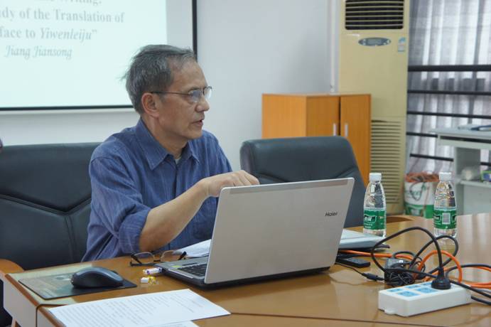 蒋坚松教授向听众介绍古文英译的语篇联结问题