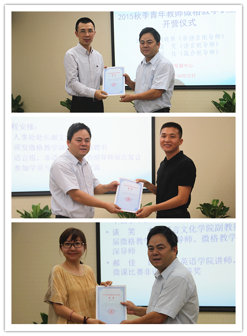 本网讯 10月22日下午,由bc365主办的2015秋季青年教师微格教学训练营开营仪式如期举行,人事处处长谢文新、东方语言文化学院副教授谈笑、商学院副教授刘晓琴、2015新入职教师及其他感兴趣的教师学员出席了开营仪式,由bc365主任孙远雷主持。