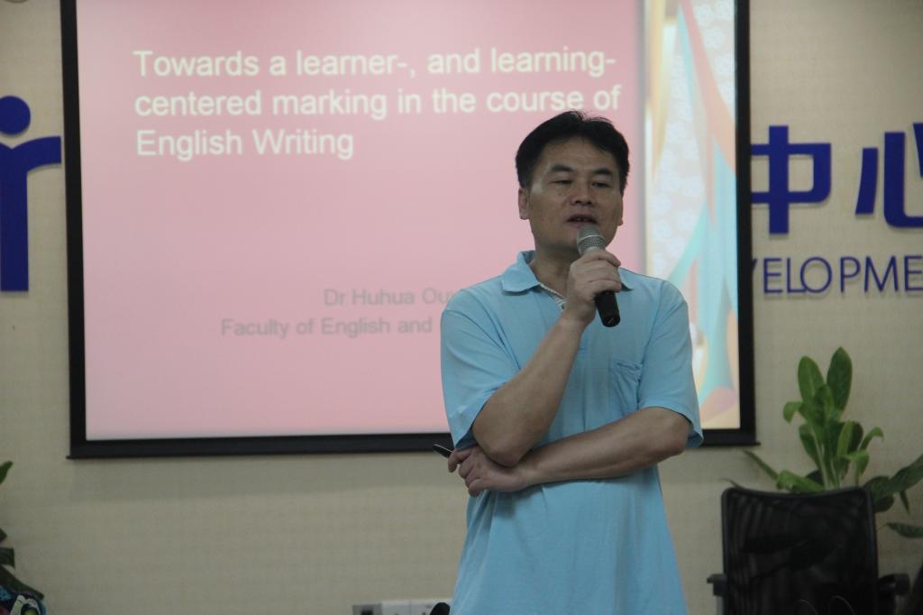 研修班的第一堂课程,由英文学院欧阳护华教授主讲的《如何实施学生学习中心的教学法改革——以写作课互评互改为例》准时开讲。该课程主要围绕“老师不改作业”这个话题展开,探讨现行教师批改作业的传统方式的弊端和问题,启发在场老师思考,引出来自西方教研成果的作业互评互改模式的介绍,细致讲解这种新的写作课教学法改革的优点和特色之处,给在场的中国外语教师带来了耳目一新的教学体验和策略,激发了他们改革教学模式的热情和动力。